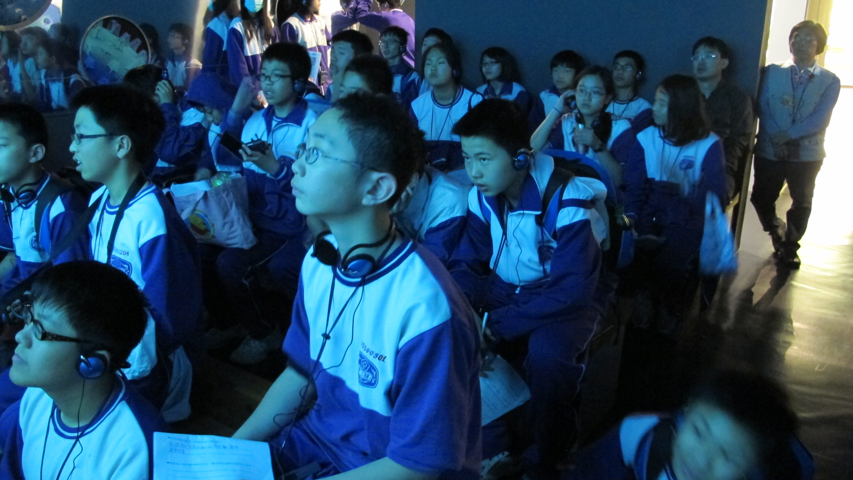 林口國中老師帶著學校七八年級資優班學生 31 人,利用特色課程的時間到海科館的水產廳上課。學生仔細聆聽海科館志工的導覽,同時好奇地提出許多問題,並對於水產廳內的「魚車」、「鏢旗魚」、「幫吳郭魚亂點鴛鴦譜」等互動遊戲相當著迷,藉著互動遊戲的體驗,瞭解許多原本只出現在課本中「側線」、「配種」、「雜交」……等科學專有詞彙的意義,達到寓教於樂的效果,學生也表示希望下次有機會可以再到海科館的其他展廳進行主題式的深度學習。