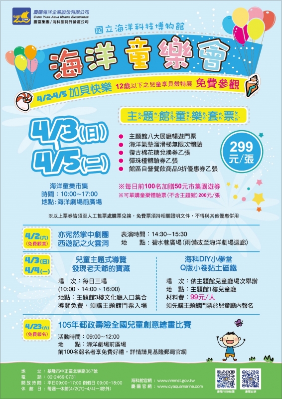 活動內容:郵政壽險兒童創意繪畫比賽現場免費報名。前100名享郵局限量贈品及海科館主題館門票乙張。凡報名即享海科館自營餐廳商店9折優惠券(特定商品除外)。