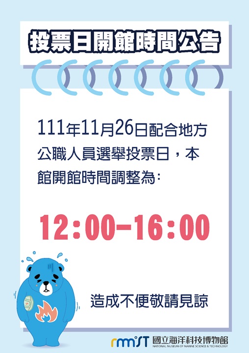 111年11月26日配合地方公職人員選舉投票日,本館開館時間調整為12:00-16:00