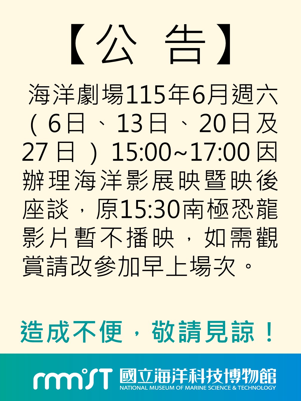 海洋劇場115年6月週六(6日、13日、20日及27日)15:00~17:00因辦理海洋影展映暨映後座談,