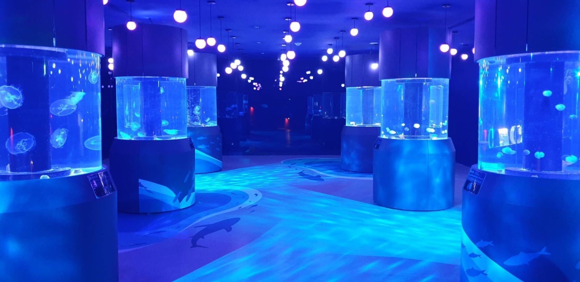 潮中舞者 探索生命的循環 世上的生物生存要有本事外,繁衍下一代是生物界的重要任務,許多的海洋生物的幼生都是以浮游型態為起點,海中最大型的浮游生物就是水母,不論是熱帶或是溫帶水域、深海或是淺水域都可以看見牠們翩翩起舞的蹤跡,在潮下舞者光影中,宛如海浪般,與晶瑩剔透的水母一同隨著音樂旋律輕柔起舞。
