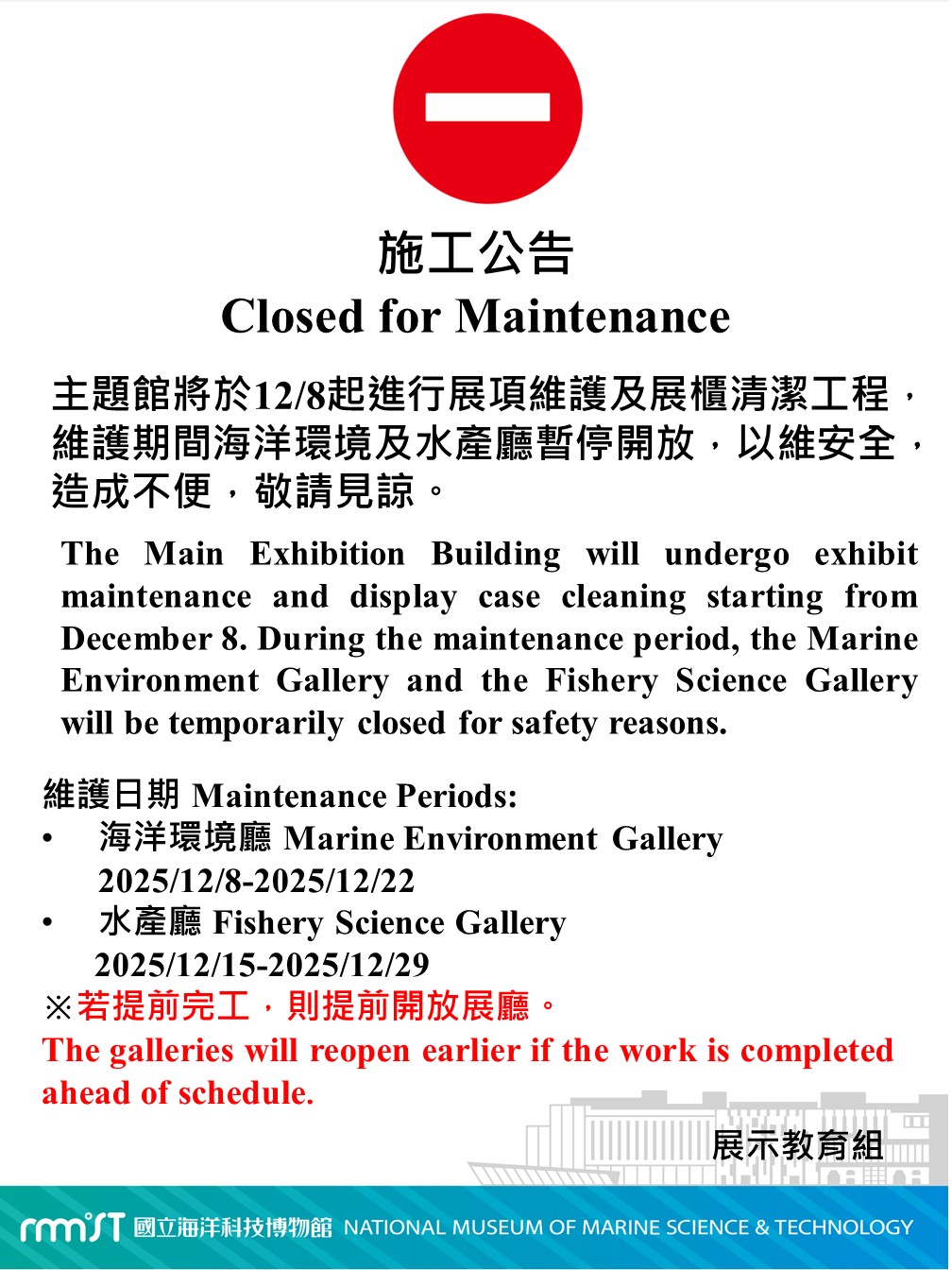 【公告】主題館將於12/8起進行展櫃清潔工程, 維護期間部分展廳暫停開放