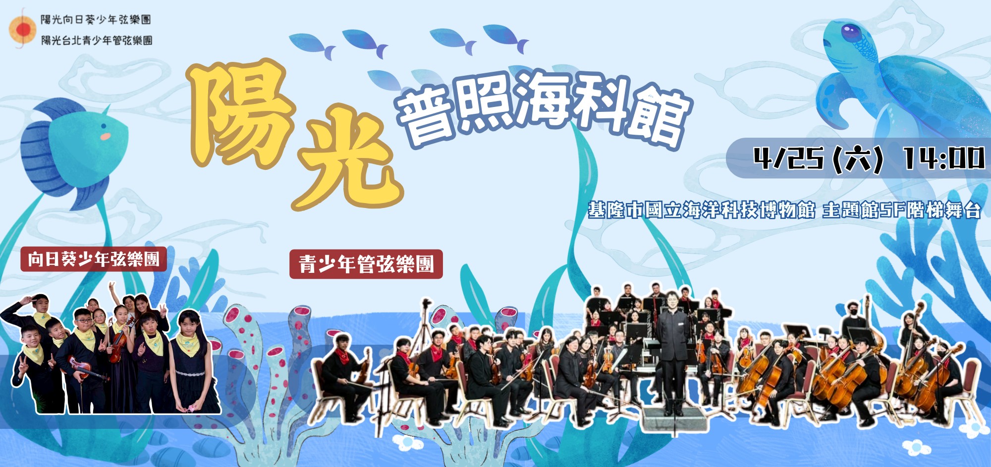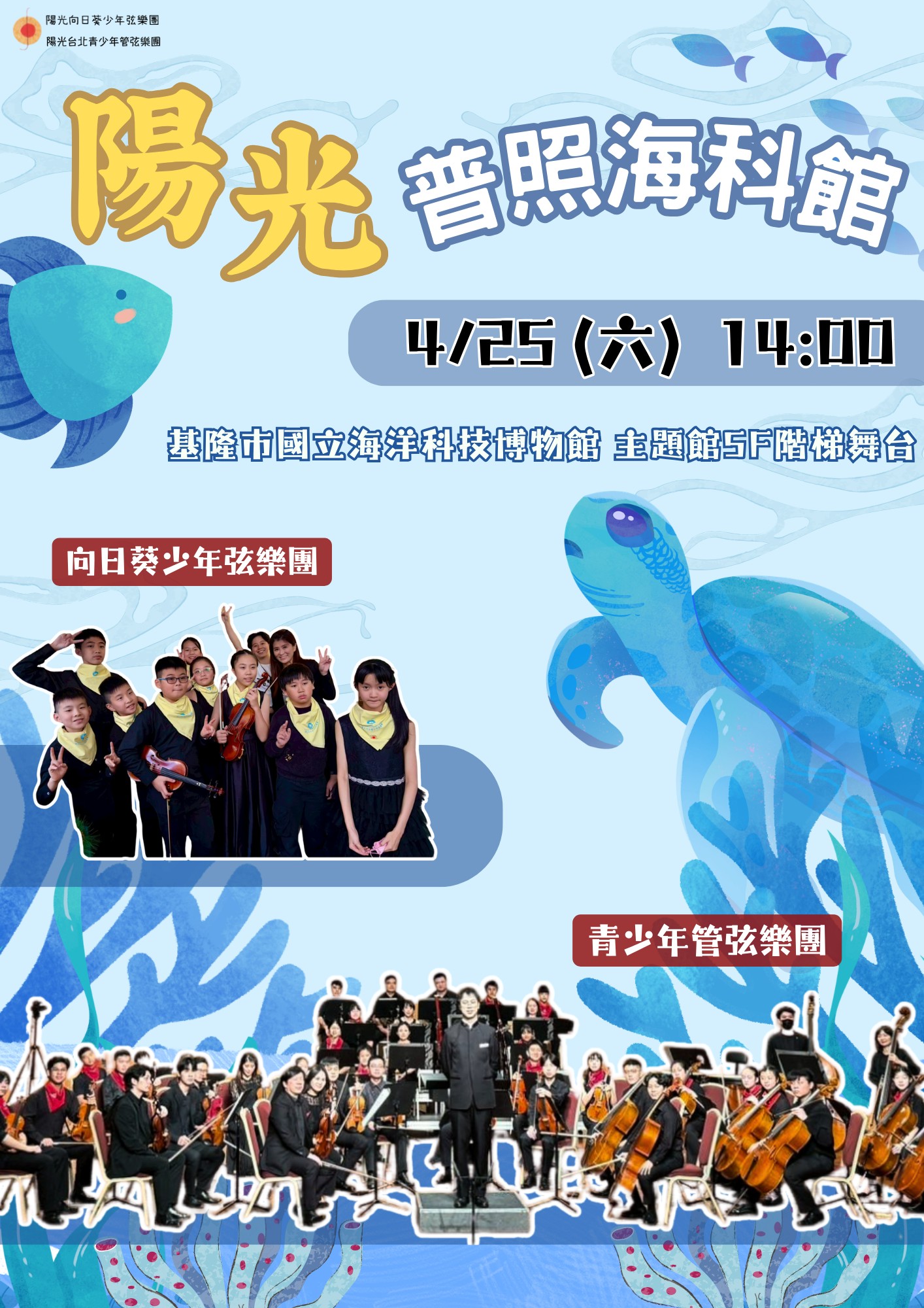 樂來海科音樂饗宴,陽光台北交響樂團蒞臨海科館演出。將由陽光台北青少年管弦樂團以及陽光向日葵少年弦樂團,一起為大家帶來精彩的演出。歡迎大家一起來聆聽,享受一場陽光普照的音樂會。