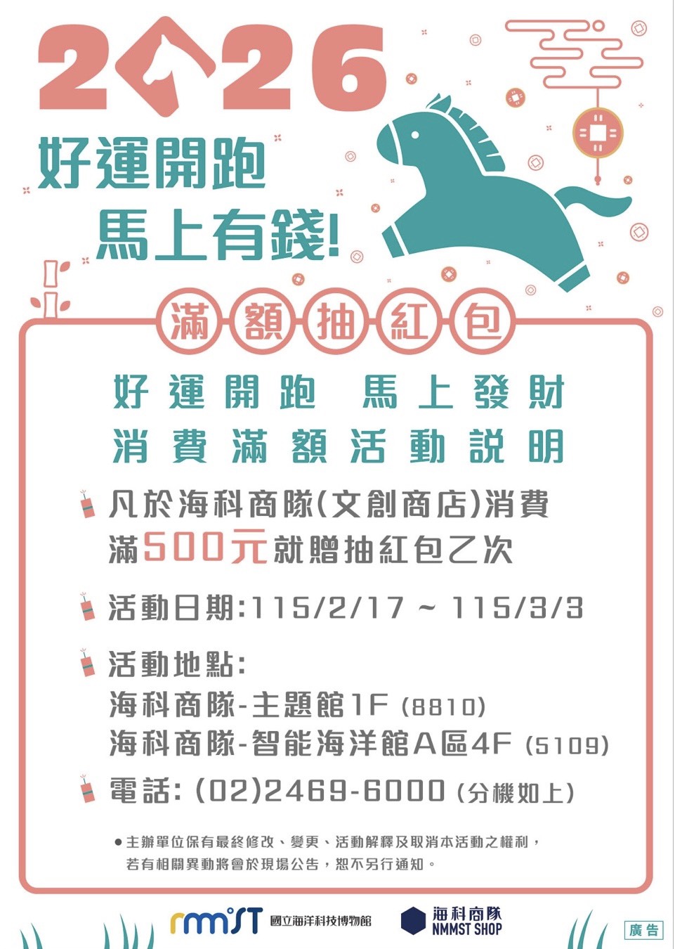 2/17-3/3 期間於海科商隊(主題館1F、智能館A區4F) 消費滿 500 元就能抽滿額禮,有超值禮品等您帶回家! |